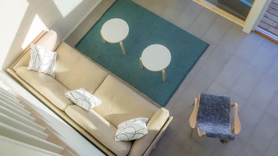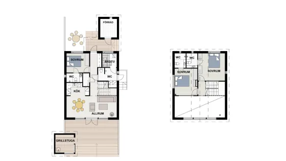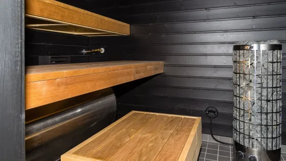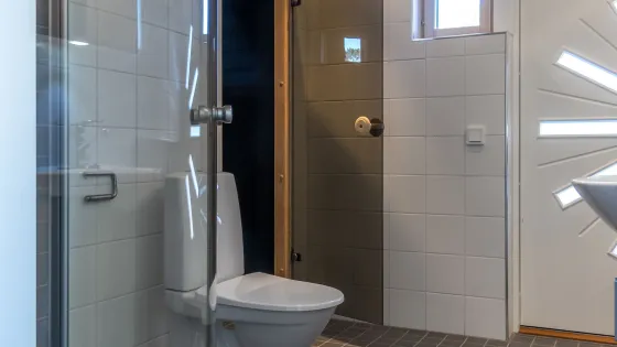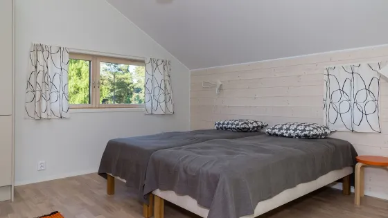 101 m². Tre dubbelrum med var sin toalett och dusch. Badrum, dusch och bastu. Komplett kök med matplats, kyl/frys, diskmaskin, spis, brödrost, kaffe- och vattenkokare samt mikrovågsugn. Vardagsrum med TV och radio. Wi-Fi och AC finns. Stor solterrass med grillplats med kolgrill inkl. kol och tändvätska. Eget bryggområde för båt. Möjlighet att hyra motorbåt inkl. 10 l bensin till egen brygga.