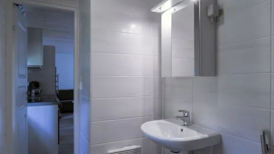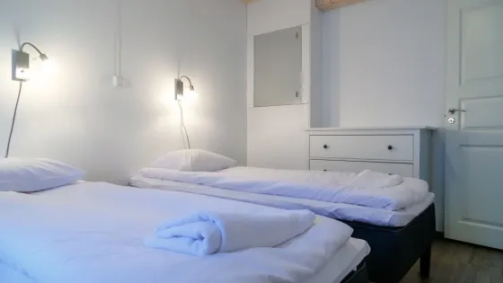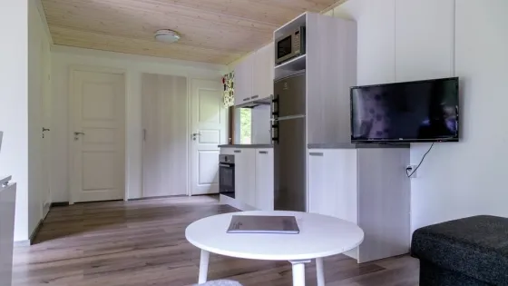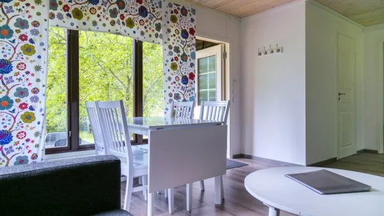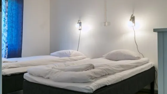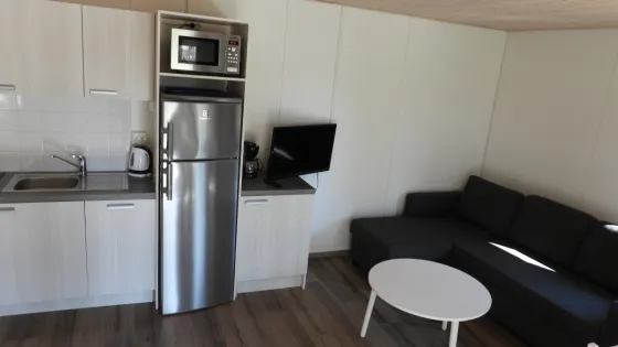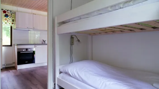39 sq. meters. Two bedrooms, one with two beds and one with a bunk bed. WC and shower. Living room with a sofa bed, TV, radio and fireplace. Wi-Fi and air conditioning. Complete kitchen with dining table, fridge/freezer, dish washer, stove, toaster, coffee machine, water kettle and micro wave.