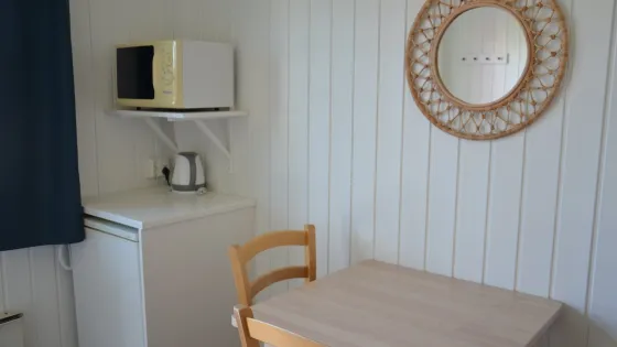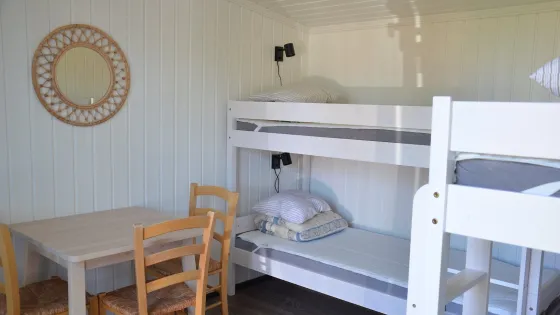 11 m2. Huone, jossa kaksi kerrossänkyä, ruokapöytä, jääkaappi, mikroaaltouuni ja vedenkeitin.