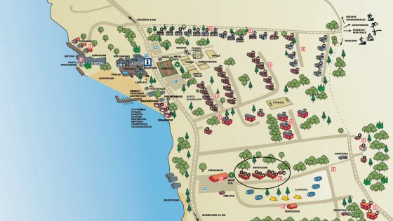 Pääsy huoltorakennukseen, jossa Wi-Fi, WC, suhkut, keittomahdollisuus, pesutupa ja yleinen sauna.
